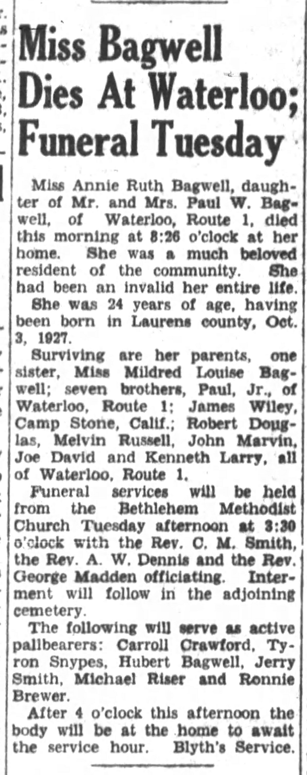 Annie Ruth Bagwell was born on 3 October 1927 in South Carolina.1 She was the daughter of Paul William Bagwell Sr. and Sarah Anne Blum. Annie Ruth Bagwell died on 28 January 1952 in South Carolina at age 24.1 She was buried at Bethlehem Union Church Cemetery, Waterloo, Laurens County, South Carolina.1