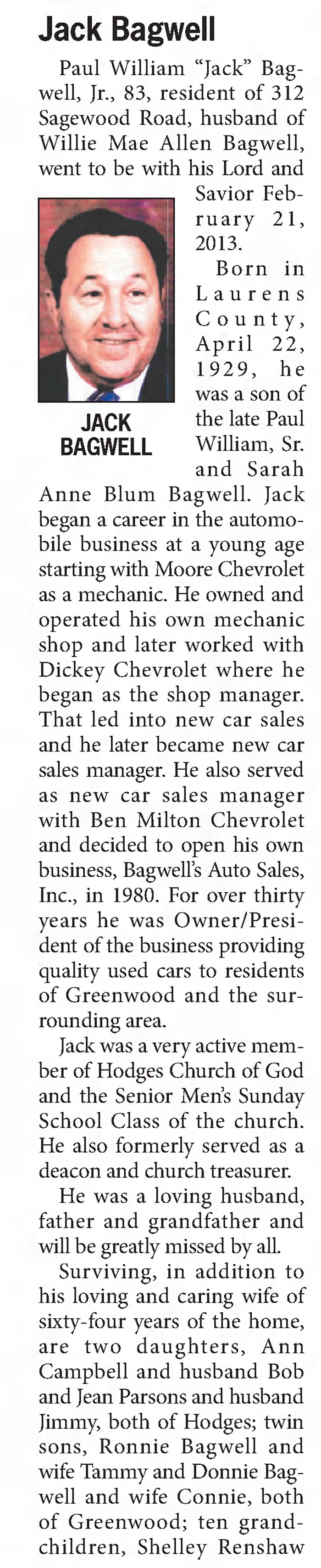 Paul William "Jack" Bagwell Jr. was also known as Jack Bagwell.1 He was born on 22 April 1929 in Laurens County, South Carolina.1,2 He was the son of Paul William Bagwell Sr. and Sarah Anne Blum.2 Paul William "Jack" Bagwell Jr. married Willie Mae Allen on 18 December 1948 at Greenwood County, South Carolina.1 Paul William "Jack" Bagwell Jr. died on 21 February 2013 in Greenwood County, South Carolina, at age 83 Paul William "Jack" Bagwell, Jr., 83, resident of 312 Sagewood Road, husband of Willie Mae Allen Bagwell, went to be with his Lord and Savior February 21, 2013. Born in Laurens County, April 22, 1929, he was a son of the late Paul William, Sr. and Sarah Anne Blum Bagwell. Jack began a career in the automobile business at a young age starting with Moore Chevrolet as a mechanic. He owned and operated his own mechanic shop and later worked with Dickey Chevrolet where he began as the shop manager. That led into new car sales and he later became new car sales manager. He also served as new car sales manager with Ben Milton Chevrolet and decided to open his own business, Bagwell's Auto Sales, Inc., in 1980. For over thirty years he was Owner/President of the business providing quality used cars to residents of Greenwood and the surrounding area. Jack was a very active member of Hodges Church of God and the Senior Men's Sunday School Class of the church. He also formerly served as a deacon and church treasurer. He was a loving husband, father and grandfather and will be greatly missed by all. Surviving, in addition to his loving and caring wife of sixty-four years of the home, are two daughters, Ann Campbell and husband Bob and Jean Parsons and husband Jimmy, both of Hodges; twin sons, Ronnie Bagwell and wife Tammy and Donnie Bagwell and wife Connie, both of Greenwood; ten grandchildren, Shelley Renshaw and husband Jason, Michael Parsons and wife Amy, Melanie Davis and husband Cal, Chrissy Phillips and husband Sam, Amanda Hall and husband Tanner, Beth Graham and husband Brandon, Brandon Bagwell and wife Eliza, Josh Bagwell, Christopher Bagwell and Taylor Bagwell; fifteen great-grandchildren, Brianna King, McKenzie Graham, Kaitlyn Phillips, Savanna Graham, Lauren Phillips, Landen Parsons, Alyssa Graham, Sarah Renshaw, Perrin Bagwell, Megan Renshaw, Annslee Hall, Sawyer Bagwell, Aiden Hall, Blair Bagwell and Aiden Bagwell; sister, Mildred Adams of Greenwood; and brother, Johnny Bagwell of Anderson. Jack was preceded in death by a sister, Annie Ruth Bagwell; brothers, J.W. Bagwell, Bob Bagwell, Melvin Bagwell, Joe Bagwell and Larry Bagwell; and great-grandson, Conner Parsons. Burial in Greenwood Memorial Gardens. Blyth Funeral Home.1,2 He was buried on 24 February 2013 at Greenwood Memorial Gardens, Hodges, Greenwood County, South Carolina.1,2