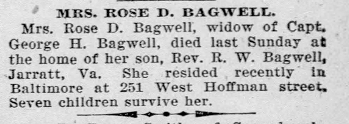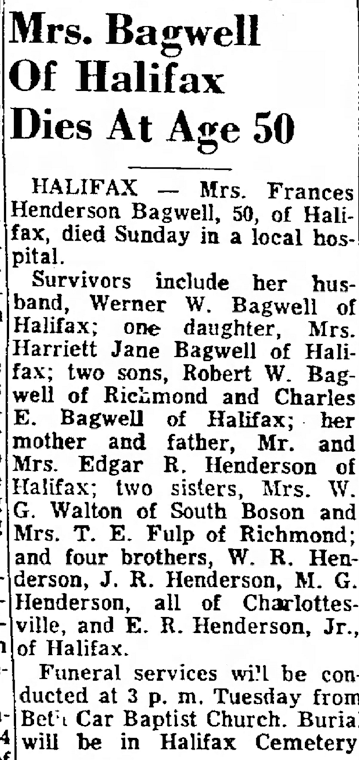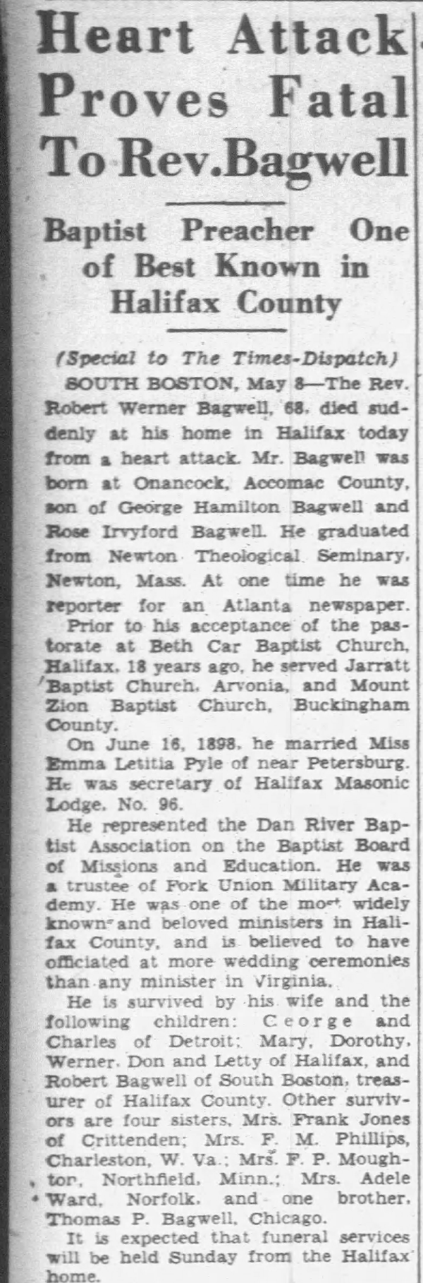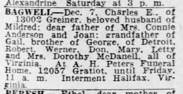 Died in Detroit,born in Jarrett,Virginia to Rev.R.W.Bagwell,of Halifax.