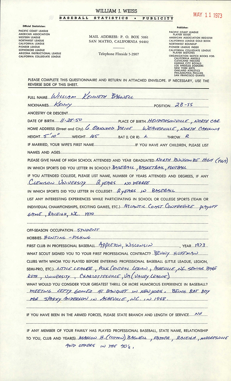 He was born July 10, 1917, in Henderson County and was a resident of Buncombe County since 1957. He was next to the last child of 12 children born to the late John Bagwell and Ellen Garren Bagwell. He attended Western Carolina University and Wofford College. He played baseball at Spartanburg-Methodist College and Wofford College. He enjoyed his professional baseball career with the Raleigh Capitals, the Richmond Colts and Mooresville. After returning from World War II, he returned to pro ball for a brief time, including mill ball with the Berkley Spinners, before his teaching/coaching career. He was a retired school teacher and coach at Erwin High School and coached many youth teams throughout the years. As a tribute to him, the baseball field at Erwin bears his name.