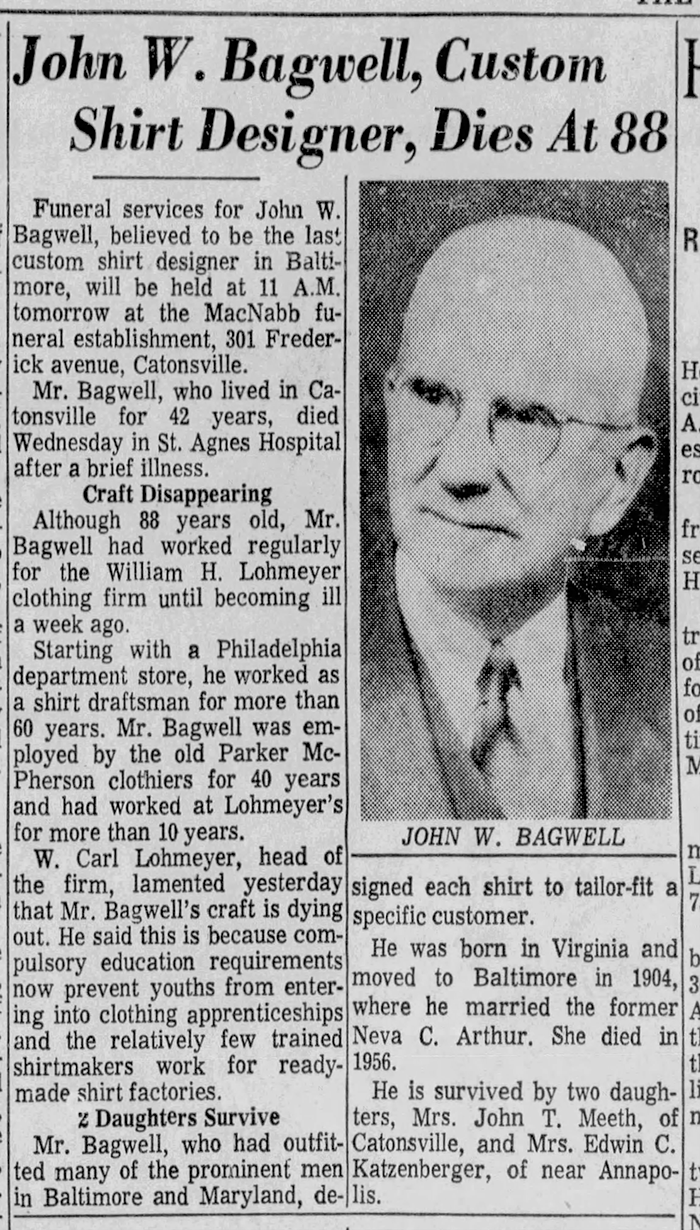 John Watson Bagwell was born on 16 November 1881 in Exmore, Northampton County, Virginia. He was the son of William Healy Bagwell and Susan Elizabeth Watson. John Watson Bagwell married Neva Constance Arther on 7 September 1904 at Fulton Avenue Baptist Church, Baltimore, Maryland. John Watson Bagwell died on 26 February 1969 in Baltimore, Baltimore County, Maryland, at age 87. He was buried on 1 March 1969 at Loudon Park Cemetery, Baltimore, Baltimore City, Maryland.