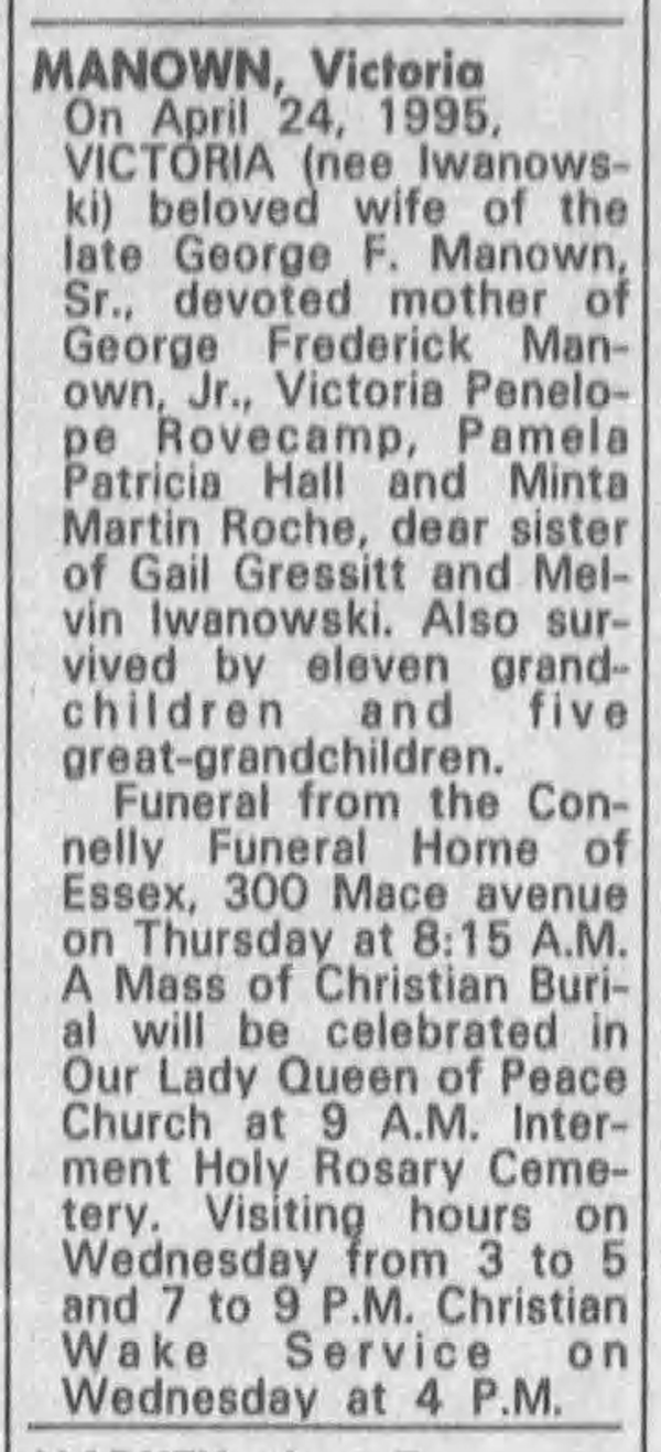 Victoria Iwanonwski was born on 6 March 1919 in Maryland. As of after 1930,her married name was Manown. She married George Frederick Manown, son of Edward Crane Manown and Winona Grace McClain, after 1930. Victoria Iwanonwski died on 24 April 1995 in Baltimore, Baltimore County, Maryland, at age 76. She was buried on 27 April 1995 at Holy Rosary Cemetery, Dundalk, Baltimore County, Maryland.