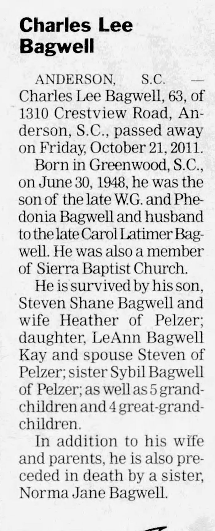 Charles Lee Bagwell was born on 30 June 1948 in Greenwood County, South Carolina.1 He was the son of William Gailey Bagwell and Constance Phedonie Devall. Charles Lee Bagwell married Carol Latimer after 1965. Charles Lee Bagwell died on 21 October 2011 in Anderson, Anderson County, South Carolina, at age 63.1 He was buried at South Lawn Memorial Gardens, Anderson, Anderson County, South Carolina.1
