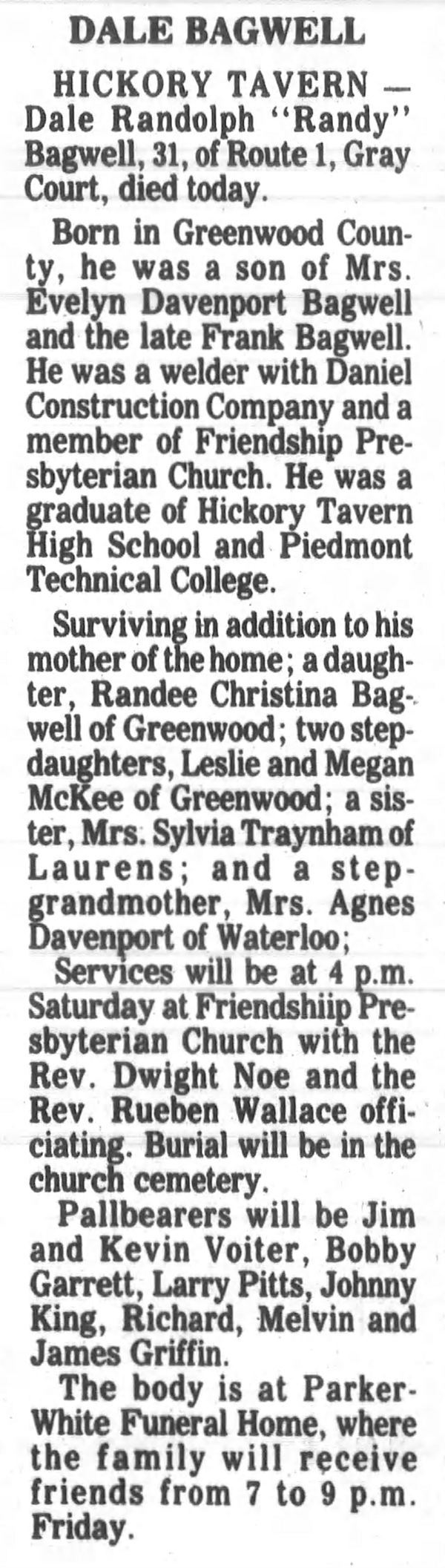 - Dale Randolph Bagwell+ b. 28 Sep 1951, d. 16 Jun 1983