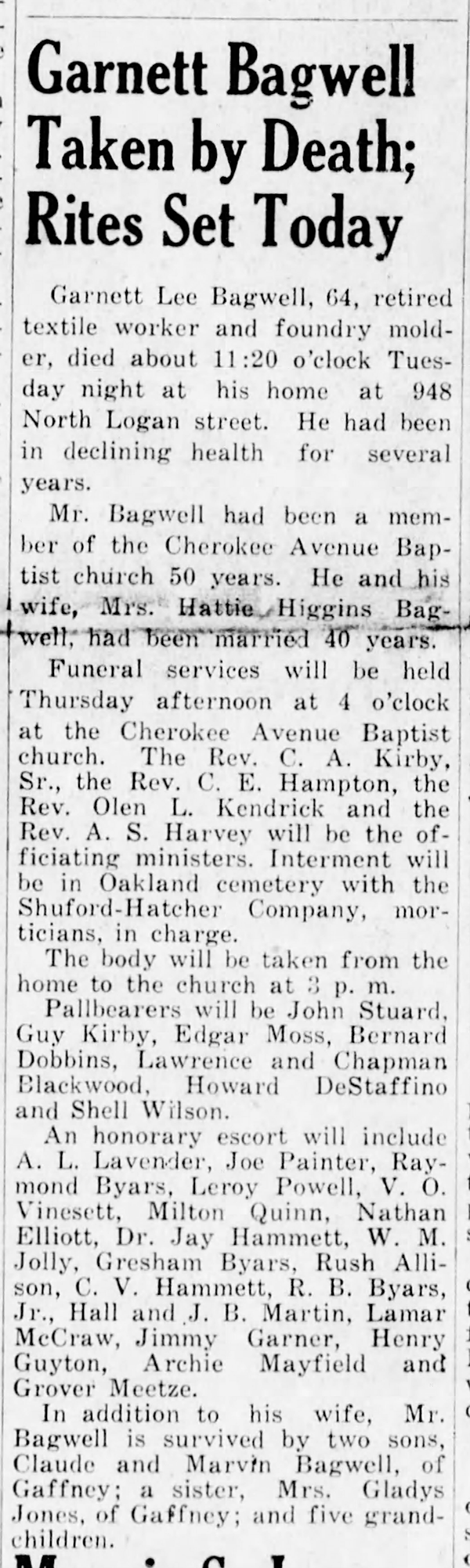Garnett Lee Bagwell was born on 7 November 1888 in Madison, Morgan County, Georgia. He was the son of Greenlee J. Bagwell and Ivanona Cunningham. Garnett Lee Bagwell married Hettie Higgins before 1915. Garnett Lee Bagwell died on 10 June 1952 in Gaffney, Cherokee County, South Carolina, at age 63. He was buried on 12 June 1952 at Oakland Cemetery, Gaffney, South Carolina.