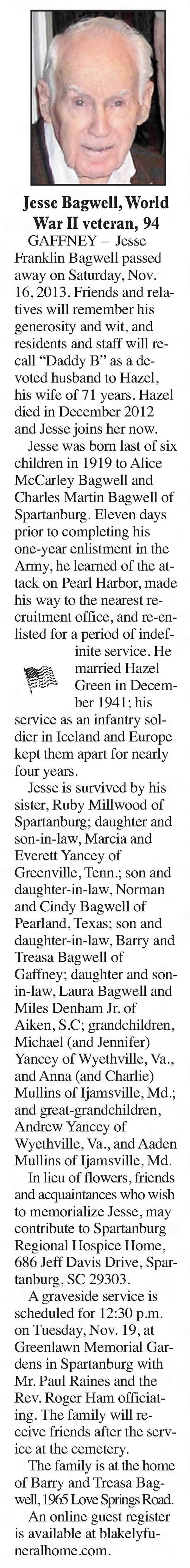 Hazel died in December 2012 and Jesse joins her now. Jesse was born last of six children in 1919 to Alice McCarley Bagwell and Charles Martin Bagwell of Spartanburg.