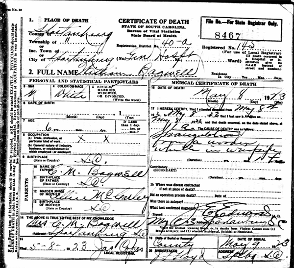 William Bagwell was also known as Charles William Cooper Bagwell. He was born on 17 October 1916 in South Carolina. He was the son of Charlie Martin Bagwell and Alice Octavia McCarley. William Bagwell died on 8 May 1923 in Spartanburg, Spartanburg County, South Carolina, at age 6 asphyxiation from a wooden whistle in his windpipe. He was buried at Zion Hill Baptist Church Cemetery, Spartanburg, Spartanburg County, South Carolina.
