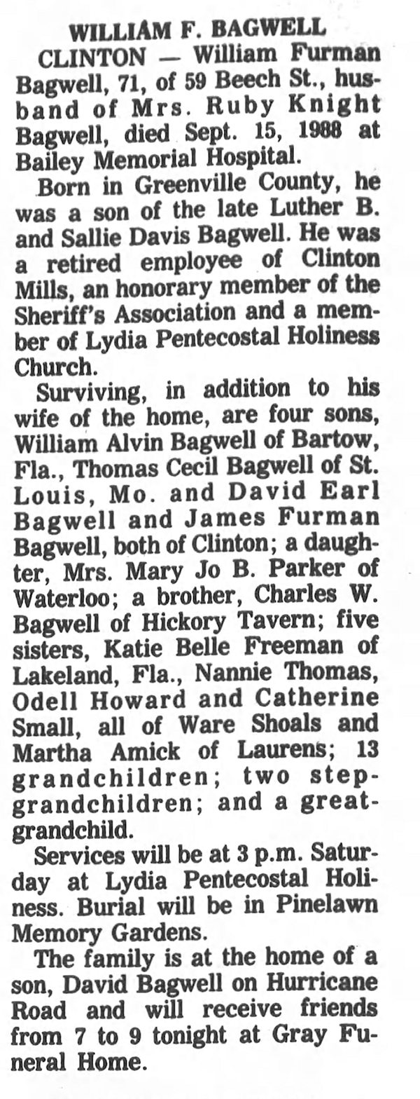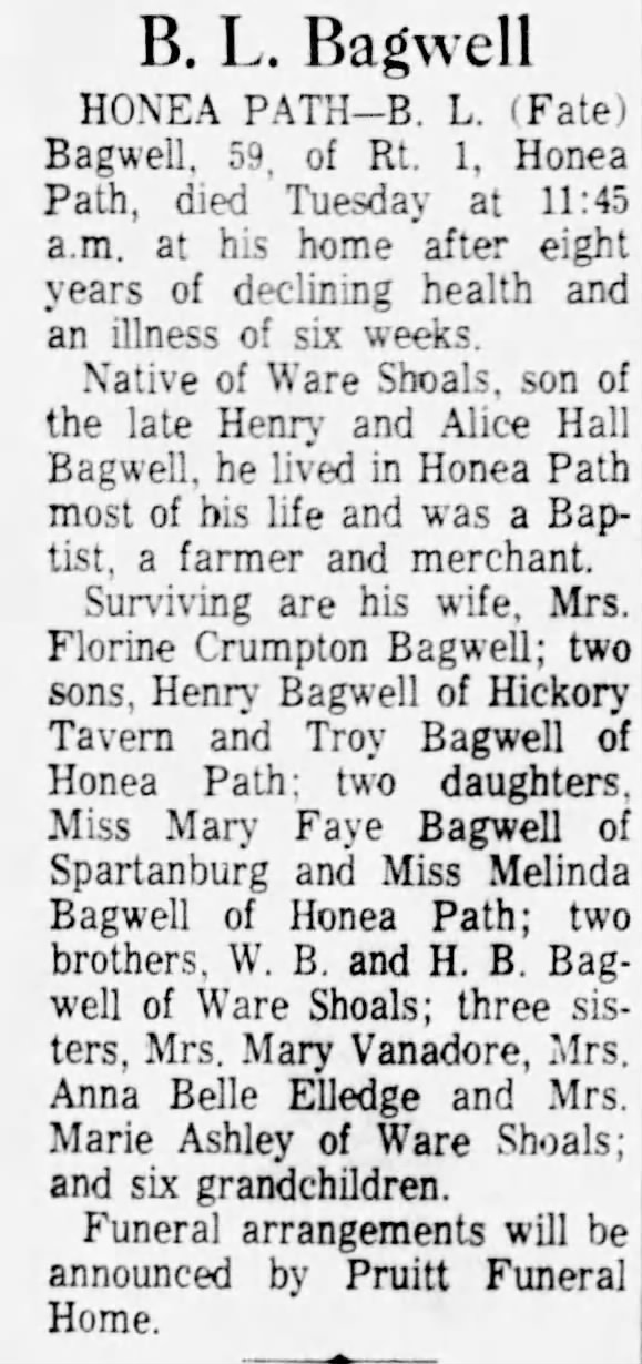 Survivors include a son, Troy Bagwell of Honea Path; a daughter, Mrs. James (Mary) Wheeler of Columbia; three sisters, Dorothy Roach of Honea Path, Lina McDonald of Del Rio, Texas and Sadie Hannah of Taylors; nine grandchildren; and nine great-grandchildren.