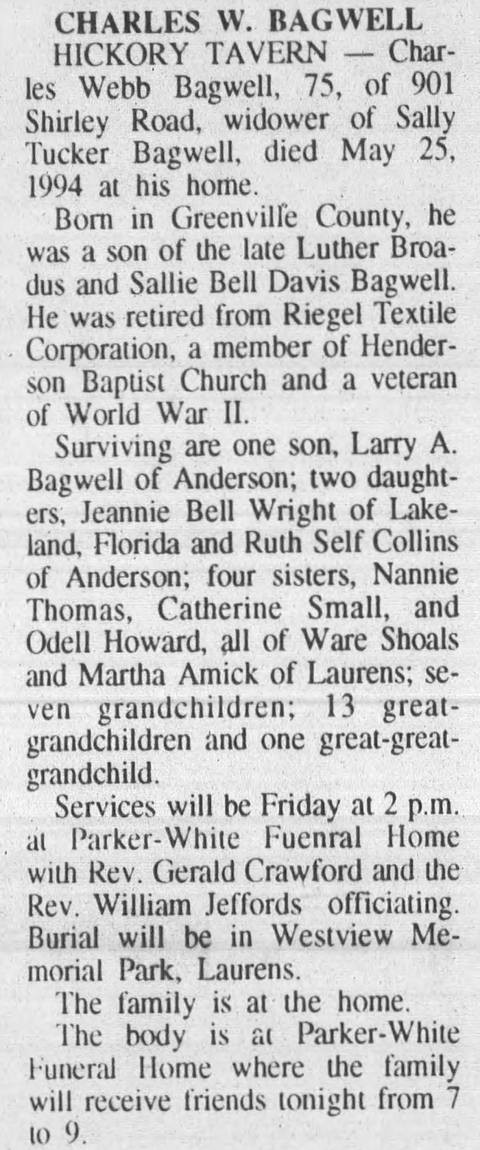 Charles Webb Bagwell was born on 26 July 1919 in Greenville County, South Carolina. He was the son of Luther Broadus Bagwell and Sallie Bell Davis. Charles Webb Bagwell married Mary Morgan Woods in 1941. He served in the Army during World War II from 24 November 1942 to 31 January 1946. Charles Webb Bagwell married Sallie Tucker on 7 June 1946. Charles Webb Bagwell lived in 1988 in Hickory Tavern, Laurens County, South Carolina. He died on 25 May 1994 in Hickory Tavern, South Carolina, at age 74. He was buried on 27 May 1994 at Westview Memorial Park, Laurens, Laurens County, South Carolina.