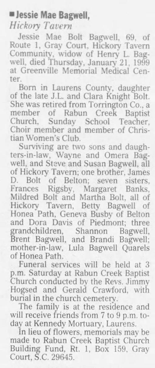 Jessie Mae Bolt was born on 15 March 1929.1 As of after 1945,her married name was Bagwell. She married Henry Lafayette Bagwell, son of Berry Lafayette Bagwell and Daisy Lula Smith, after 1945. Jessie Mae Bolt died on 21 January 1999 at age 69.1 She was buried at Rabun Creek Baptist Church Cemetery, Hickory Tavern, Laurens County, South Carolina.1