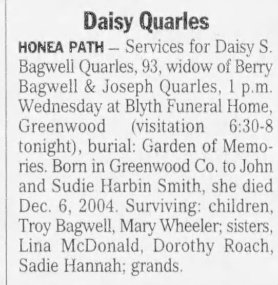 HONEA PATH ? Daisy Smith Bagwell Quarles, 93, formerly of Honea Path, widow of Joseph E. Quarles, died Monday, Dec. 6, 2004 at Kershaw County Medical Center in Camden.