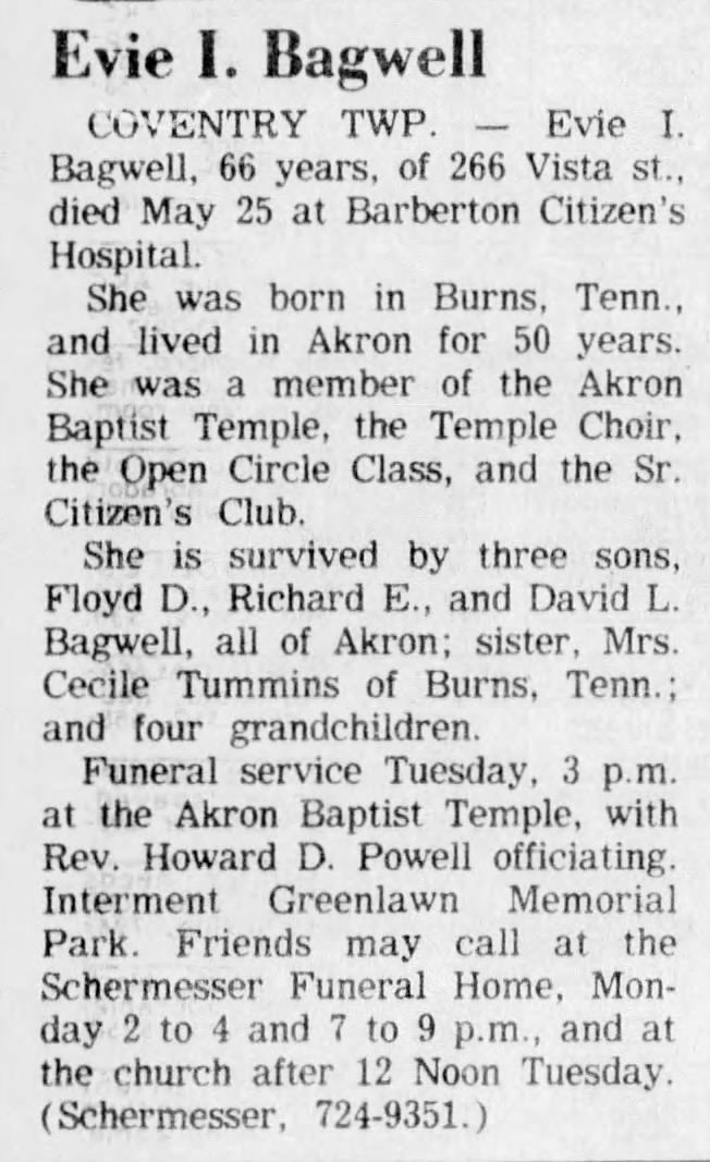 Evie Thompson was born on 12 April 1913 in Tennessee. As of 12 April 1929,her married name was Bagwell. She married Adrian Leroy Bagwell, son of Christopher Columbus Bagwell and Allie Duke, on 12 April 1929 at Dickson County, Tennessee. Evie Thompson died on 25 May 1979 in Barberton, Summit County, Ohio, at age 66. She was buried on 29 May 1979 at Greenlawn Memorial Park, Akron, Ohio.