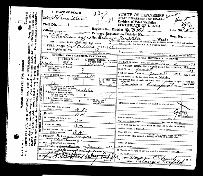 Joseph W. Bagwell was born circa May 1870 in Floyd County, Georgia. He was the son of Joel Bagwell and Harriett Susan Caroline Nowlin. Joseph W. Bagwell married Charity Harris on 10 September 1888 at Georgia. Joseph W. Bagwell died on 4 January 1933 in Erlanger Hospital, Chattanooga, Hamliton County, Tennessee. He was buried on 7 January 1933 at Greenwood Cemetery, Chattanooga, Hamilton County, Tennessee.