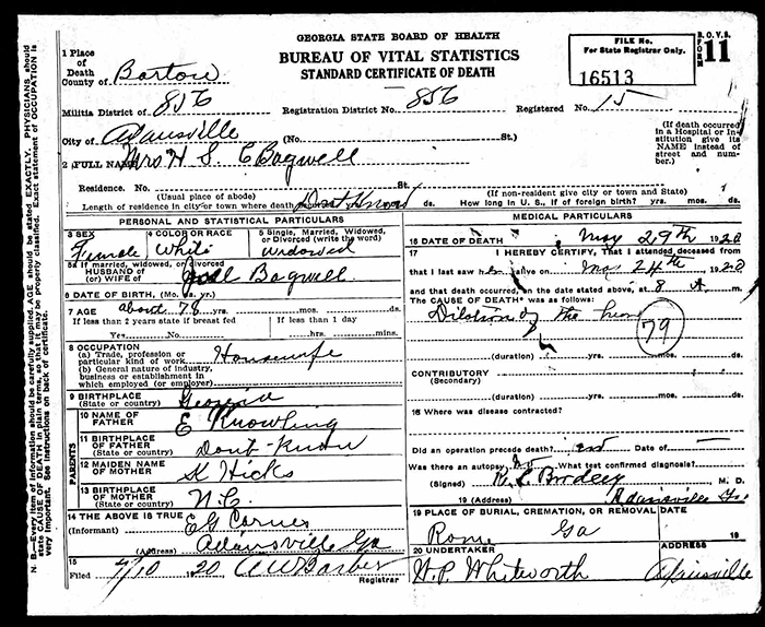 Rosa Lee Bagwell was born on 12 August 1893 in Armuchee, Floyd County, Georgia. She was the daughter of Joseph W. Bagwell and Charity Harris. As of 1908,her married name was Hicks. Rosa Lee Bagwell married Charles Dent Hicks in 1908. Rosa Lee Bagwell died on 8 May 1979 in Rome, Floyd County, Georgia, at age 85. She was buried at Oakland Cemetery, Rome, Floyd County, Georgia.