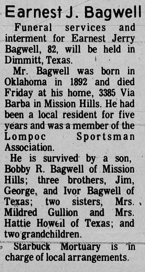 Ernest Jerry Bagwell was also known as Jerry Ernest Bagwell. He was born on 15 October 1892 in Chickasaw Nation, Oklahoma.1 He was the son of James Andrew Bagwell and Nancy Adaline Ashley. Ernest Jerry Bagwell married Bessie Ann Green before 1930. Ernest Jerry Bagwell died on 25 April 1975 in Lompoc, Santa Barbara County, California, at age 82.1 He was buried at Castro Memorial Gardens, Dimmitt, Castro County, Texas.1