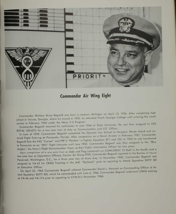 Upon completion of a one year tour as Aide and Flag Lieutenant on COMCARDIV 15 Staff in the Pacific and a two-year tour as Operations Officers, Carrier Air Group FIVE, Commander Bagwell reported to the Bureau of Naval Personnel, Washington, D.C., for a three year tour of shore duty. In November 1963, Commander Bagwell was assigned to VA-43 fro CRAG Training in the A4C "Skyhawk" prior ro reporting to Attack Squardron SIXTY SIX as Executive Officer.