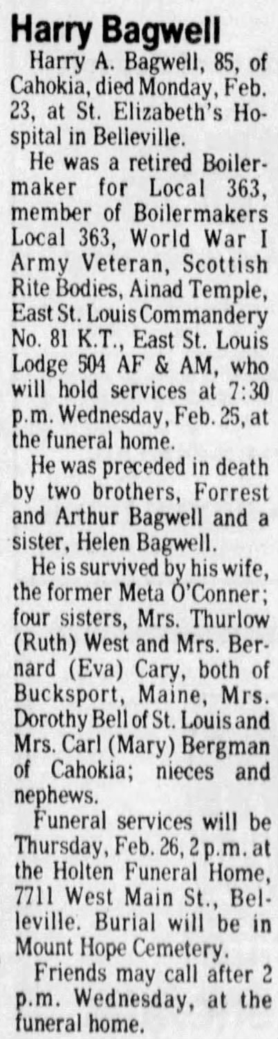Harry Arthur Albin Bagwell was born on 3 October 1895 in Chester, Randolph County, Illinois.1 He was the son of Burrell Benjamin Bagwell and Elinora Glenn Hampton. Harry Arthur Albin Bagwell married Hazel York on 11 February 1950 at Randolph County, Arkansas. Harry Arthur Albin Bagwell married Meta V. O'Connor after 1955. Harry Arthur Albin Bagwell died on 23 February 1981 in East Saint Louis, St. Clair County, Illinois, at age 85.1 He was buried at Mount Hope Cemetery, Belleville, St. Clair County, Illinois.1