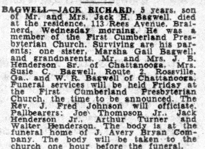 Jack Richard Bagwell was born on 11 August 1947 in Chattanooga, Hamilton County, Tennessee. He was the son of Jack Hise Bagwell and Peggy Henderson. Jack Richard Bagwell died on 19 November 1952 in Chattanooga, Hamilton County, Tennessee, at age 5. He was buried on 21 November 1952 at Greenwood Cemetery, Chattanooga, Hamilton County, Tennessee.