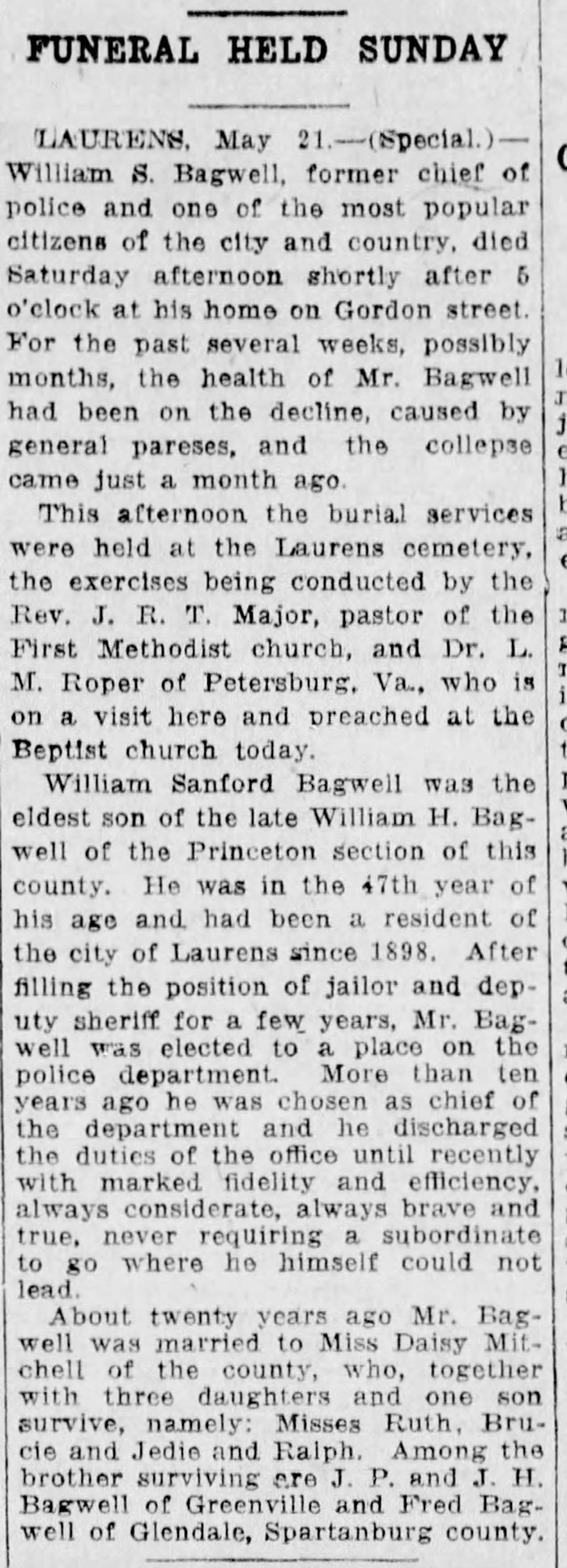 William Starling Bagwell was also known as W. S. Bagwell. William Starling Bagwell was also known as William Sanford Bagwell. He was born on 31 August 1869 in Princeton District, Laurens County, South Carolina.1 He was the son of William Henry Bagwell and Margaret Jane McClary.2 William Starling Bagwell married Daisy Mitchell after 1885.3 William Starling Bagwell died on 20 May 1916 in Laurens, South Carolina, at age 46.1 He was buried on 22 May 1916 at Laurens City Cemetery, Laurens, Laurens County, South Carolina.1