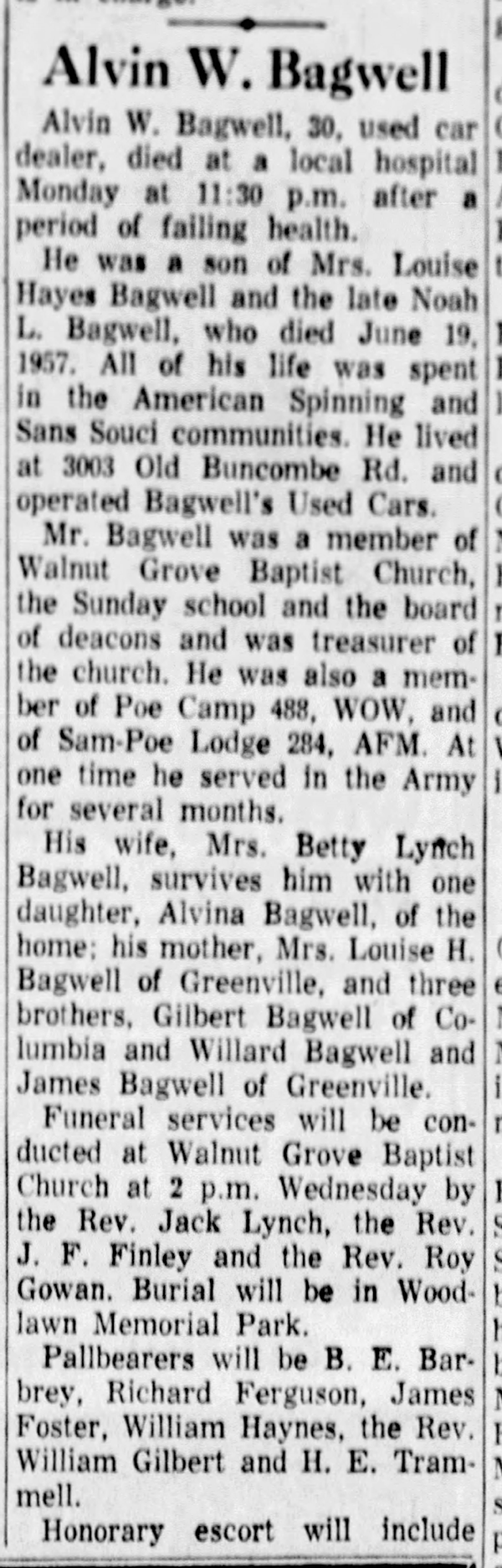 - Alvin William Bagwell+ b. 8 Mar 1928, d. 11 Mar 1958