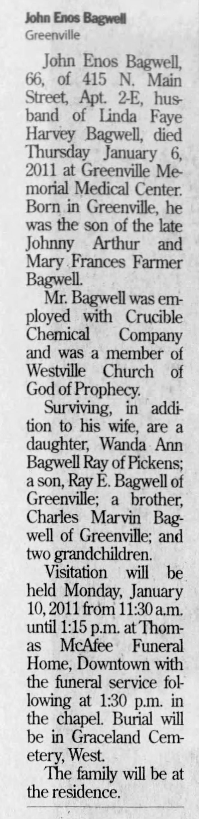 John Enos Bagwell was born in 1944 in Greenville County, South Carolina.1 He was the son of John Arthur Bagwell and Mary Frances Farmer.1 John Enos Bagwell married Linda Faye Harvey on 1 May 1965 at Greenville County, South Carolina. John Enos Bagwell died on 6 January 2011 in Greenville, Greenville County, South Carolina, John Enos Bagwell, 66, of 415 N. Main Street, Apt. 2-E, husband of Linda Faye Harvey Bagwell, died Thursday January 6, 2011 at Greenville Memorial Medical Center.