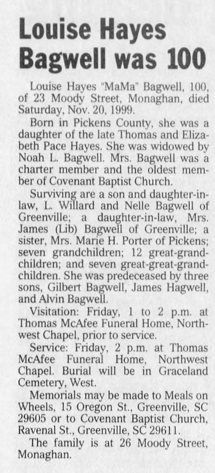 Elizabeth Louise Hayes was also known as Louise Hayes. She was born on 18 August 1899 in Pickens, Pickens County, South Carolina. As of 15 October 1916,her married name was Bagwell. She married Noah Lewis Bagwell, son of James L. Bagwell and Margaret Camelia Smith, on 15 October 1916. Elizabeth Louise Hayes married an unknown person after 1918. As of after 1918,her married name was Bagwell. She died on 20 November 1999 in Greenville, Greenville County, South Carolina, at age 100. She was buried at Graceland West Cemetery and Mausoleum, Greenville, Greenville County, South Carolina;