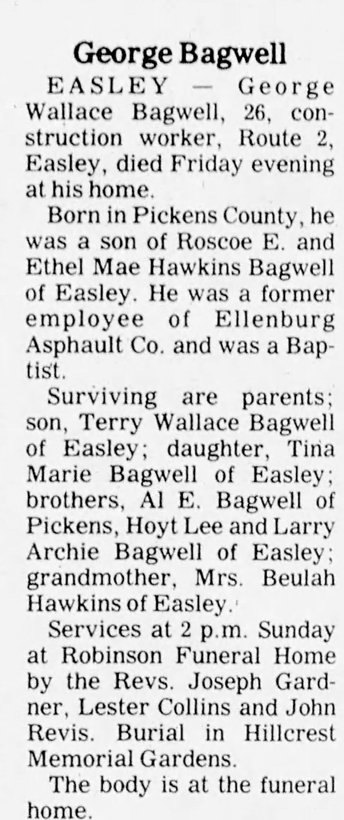 George Wallace Bagwell was born on 3 February 1951 in Pickens County, South Carolina. He was the son of Roscoe Elijah Bagwell and Ethel Mae Hawkins. George Wallace Bagwell died on 16 December 1977 in Pickens County, South Carolina, at age 26. He was buried on 18 December 1977 at Hillcrest Memorial Park, Pickens, Pickens County, South Carolina.