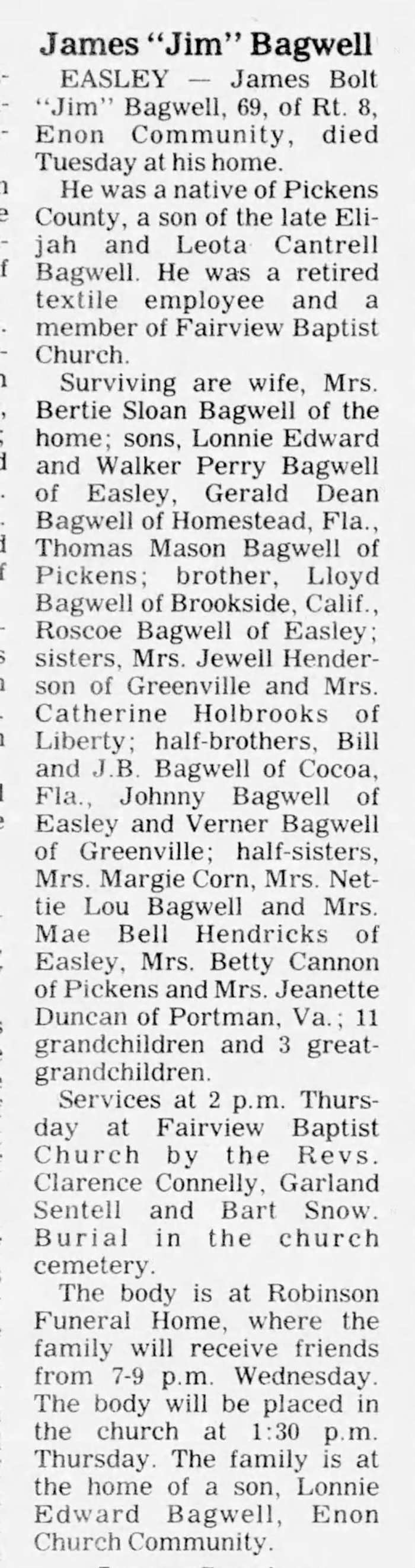 James Bolt Bagwell was born on 7 March 1907 in Pickens County, South Carolina.1 He was the son of Elijah Walker Bagwell and Leotto Cantrell. James Bolt Bagwell married Bertie Christine Sloan before 1931. James Bolt Bagwell died on 20 December 1977 in Easley, Pickens County, South Carolina, at age 70.1 He was buried on 22 December 1977 at Fairview Independent Baptist Church Cemetery, Pickens, Pickens County, South Carolina.1