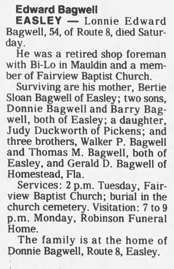 Lonnie Edward Bagwell was born on 12 January 1931 in South Carolina.1 He was the son of James Bolt Bagwell and Bertie Christine Sloan.1 Lonnie Edward Bagwell married Louise S after 1940.2 Lonnie Edward Bagwell died on 16 March 1985 at age 54.1 He was buried on 19 March 1985 at Fairview Independent Baptist Church Cemetery, Pickens, Pickens County, South Carolina.1