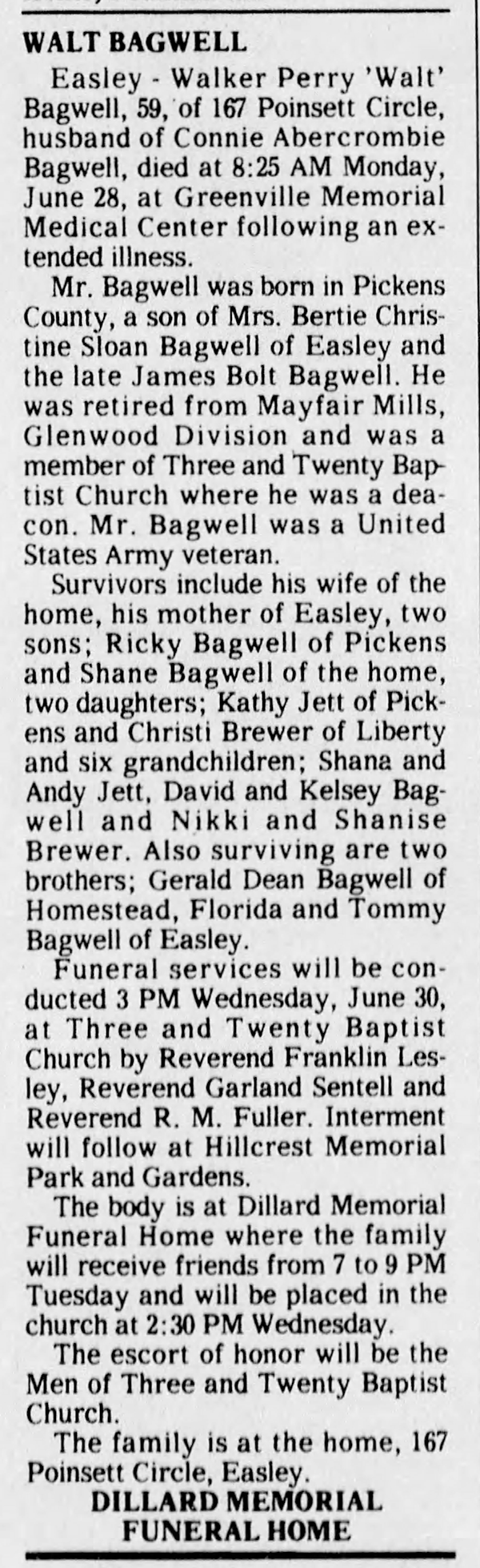 Walker Perry Bagwell was born on 23 May 1934 in South Carolina.1 He was the son of James Bolt Bagwell and Bertie Christine Sloan.2,3 Walker Perry Bagwell married Connie S. Abercrombie after 1951. Walker Perry Bagwell died on 28 June 1993 at age 59.1 He was buried on 30 June 1993 at Hillcrest Memorial Park, Pickens, Pickens County, South Carolina.1