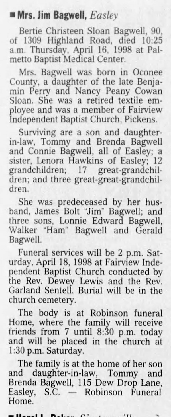 Bertie Christine Sloan was born on 27 April 1907 in Oconee County, South Carolina.1 She married James Bolt Bagwell, son of Elijah Walker Bagwell and Leotto Cantrell, before 1931. As of before 1931,her married name was Bagwell. Bertie Christine Sloan died on 16 April 1998 in Palemetto Baptist Medical Center, Columbia, South Carolina, at age 90.1 She was buried on 18 April 1998 at Fairview Independent Baptist Church Cemetery, Pickens, Pickens County, South Carolina.1