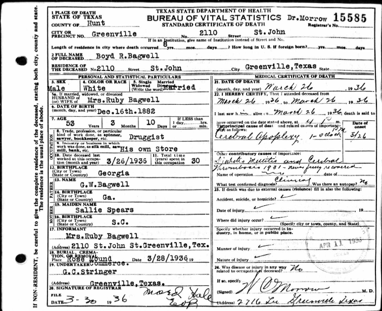 Boyd Russell Bagwell was born on 16 December 1882 in Georgia.1 He was the son of George Washington Boyd Bagwell and Sallie H. Spears.1 Boyd Russell Bagwell married Ruby L. Ridley on 24 July 1906 at Hunt County, Texas. Boyd Russell Bagwell died on 26 March 1936 in Greenville, Hunt County, Texas, at age 53.1 He was buried on 28 March 1936 at Rosemound Cemetery, Commerce, Hunt County, Texas.1