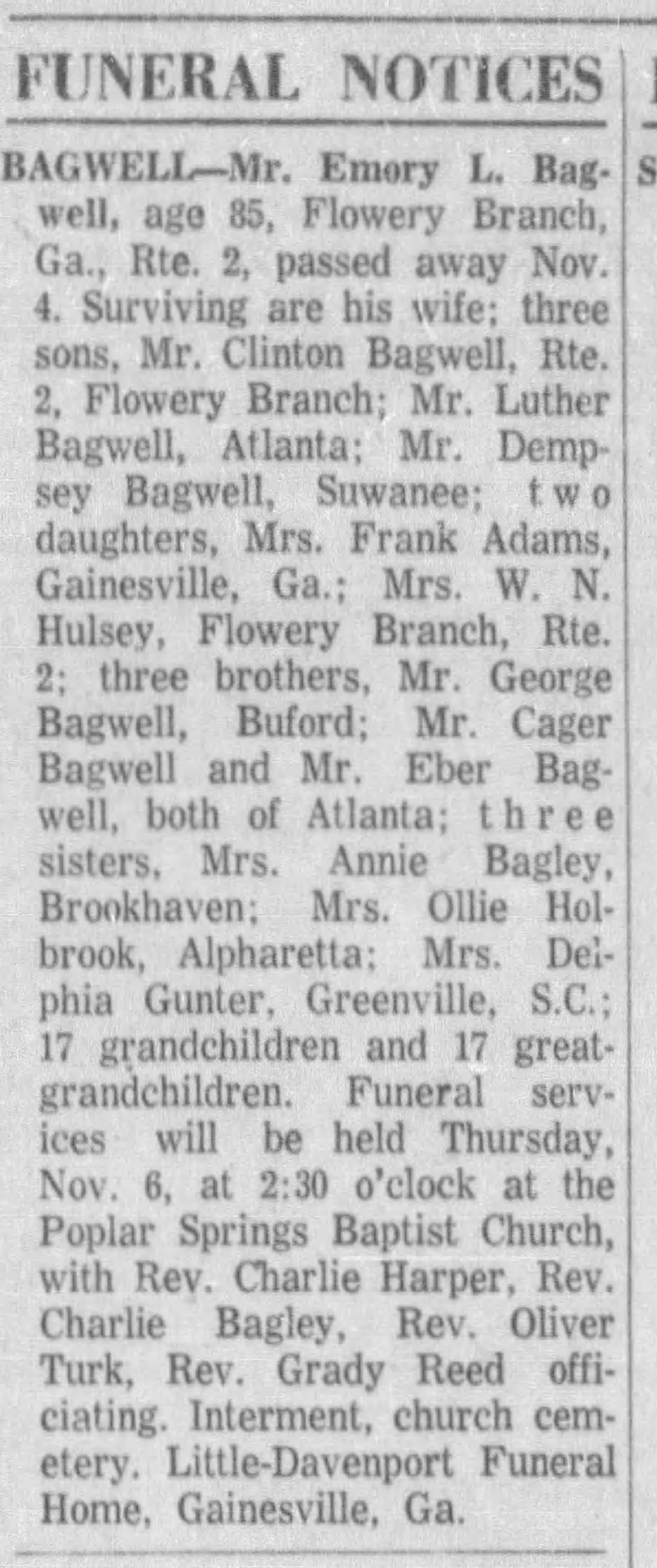 Emory Lafayette Bagwell was born on 25 October 1873 in Georgia.1,2,3 He was the son of William Blassingame Bagwell and Amanda Isabell Brashears.1 Emory Lafayette Bagwell married Loudelia Faggans, daughter of George W. Faggans and Lucy M. (?), on 23 November 1893 at Cumming, Forsyth County, Georgia. Emory Lafayette Bagwell died on 4 November 1958 in Flowery Branch, Georgia, at age 85.2,3 He was buried on 6 November 1958 at Poplar Springs Baptist Church Cemetery, Gainesville, Hall County, Georgia.3