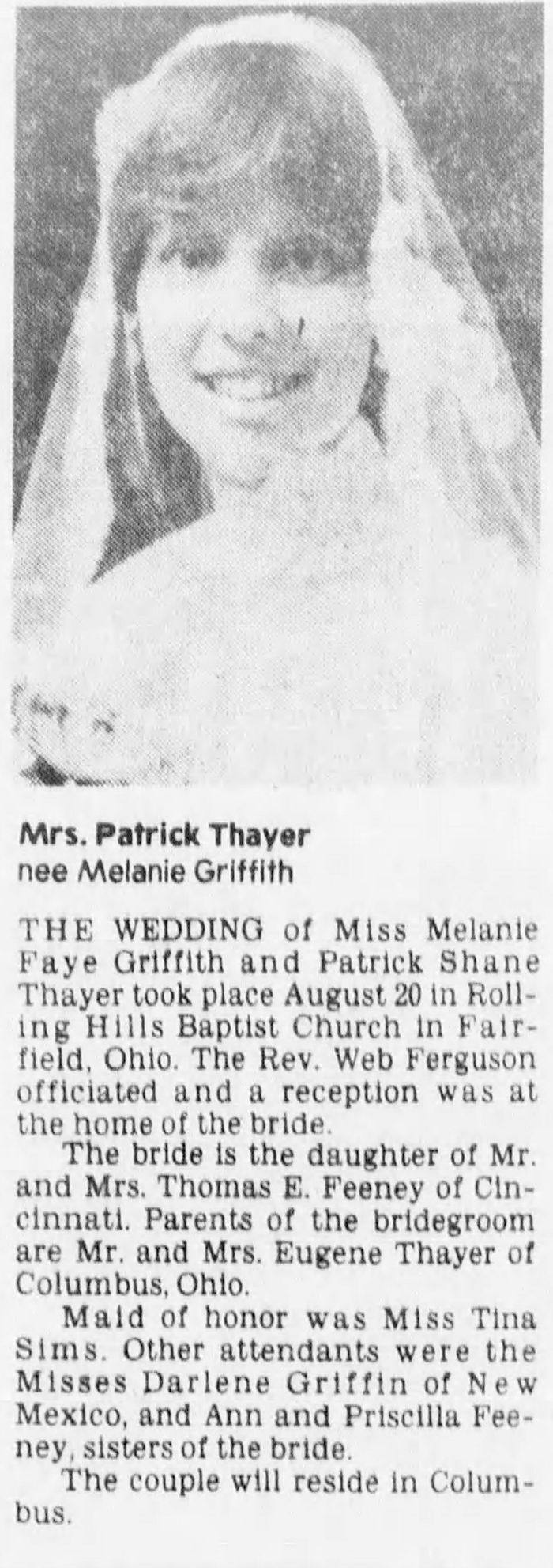 Patrick Shane Thayer married Melanie Faye Griffith, daughter of Thomas Arthur Griffith Jr. and Priscilla Bass Meek, on 20 August 1977 at Fairfield, Ohio.
