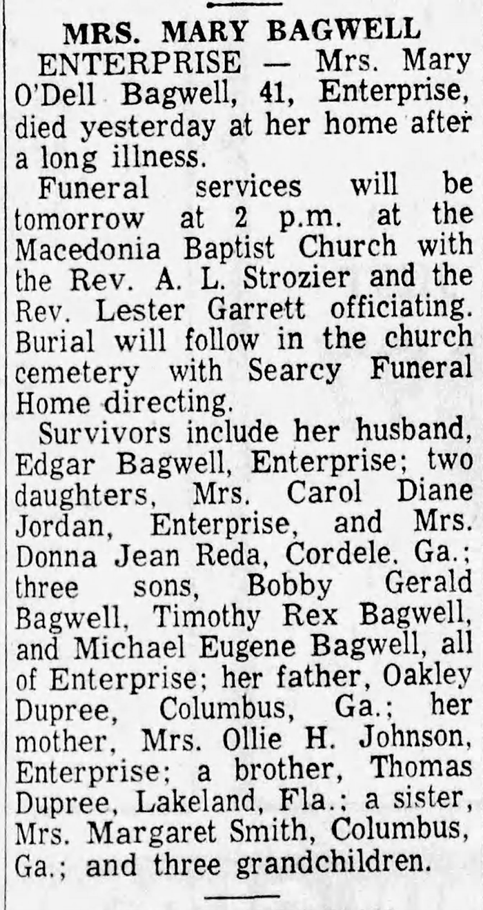 Mary Odell Dupree was born on 16 July 1931 in Houston County, Alabama.1 As of 1 November 1947,her married name was Bagwell. She married Edgar Eugene Bagwell, son of Wilburn Bagwell and Eva Grantham Vickers, on 1 November 1947 at Lake County, Florida. Mary Odell Dupree died on 8 August 1972 in Enterprise, Coffee County, Alabama, at age 41 Daughter of Oakley Dupree & Ollie Howard.