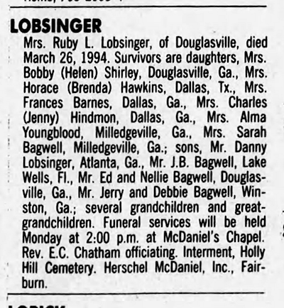 Ruby Lee Griffith was born on 30 November 1909. As of 26 December 1929,her married name was Bagwell. She married Attis Lee Bagwell, son of Bryant Bruce Bagwell and Adalee Hunt, on 26 December 1929 at Paulding County, Georgia. Ruby Lee Griffith died on 26 March 1994 in Douglas, Georgia, at age 84. She was buried on 28 March 1994 at Holly Hill Cemetery, Fairburn, Fulton County, Georgia.