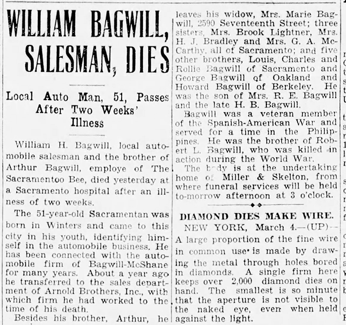 Arthur McKinley Bagwill was born on 28 March 1897 in Sacramento, Sacramento County, California. He was the son of Henry Bryant Bagwell and Rosa Etta Newkirk. Arthur McKinley Bagwill married Fern Priscilla McSweeney in 1921 at Sacramento County, California. Arthur McKinley Bagwill married Lena Clemential Radich in September 1955 at Sacramento County, California. Arthur McKinley Bagwill died on 8 February 1971 in Sacramento, Sacremento County, California, at age 73. He was buried at Saint Marys Catholic Cemetery and Mausoleum, Sacramento, Sacremento County, California.