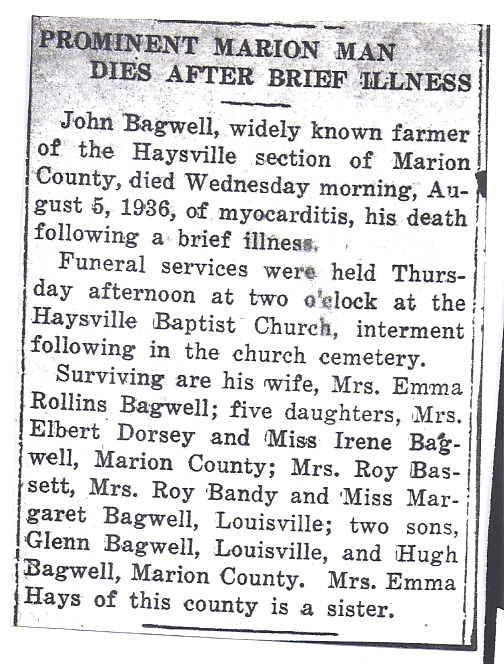 John J. Bagwell was born on 29 December 1869 in Kentucky.1,2 He was the son of Henderson O'Neal Bagwell and Sarah Chrisantha "Cassie" James.3 John J. Bagwell married Eva Alice Rollins on 22 December 1897 at Marion County, Kentucky. John J. Bagwell died on 5 August 1936 in Kentucky at age 66.1,2 He was buried on 6 August 1937 at Haysville Cemetery, Gravel Switch, Marion County, Kentucky.1