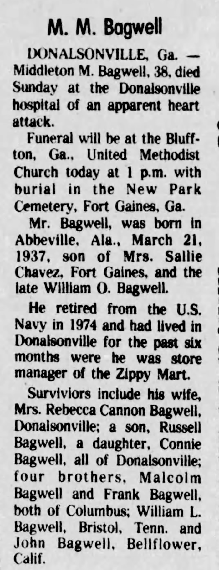 Middleton M. Bagwell was born on 21 March 1937 in Abbeville, Alabama. He was the son of William Oscar Bagwell and Sallie Van Roberson. He served in the US Navy. Middleton M. Bagwell married Rebecca Ann Cannon before September 1964. Middleton M. Bagwell died on 17 August 1975 in Donalsonville, Georgia, at age 38. He was buried on 19 August 1975 at New Park Cemetery, Fort Gaines, Clay County, Georgia.