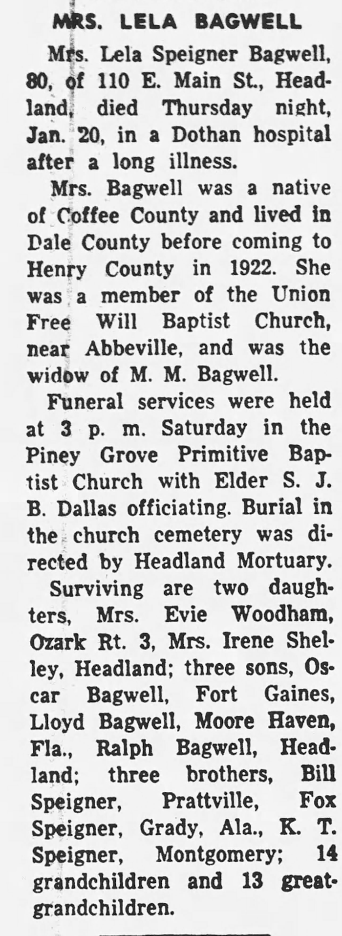 - [S4619] Lela Speigner Bagwell Grave Stone, Find a Grave, www.findagrave.com, http://www.findagrave.com/cgi-bin/fg.cgi