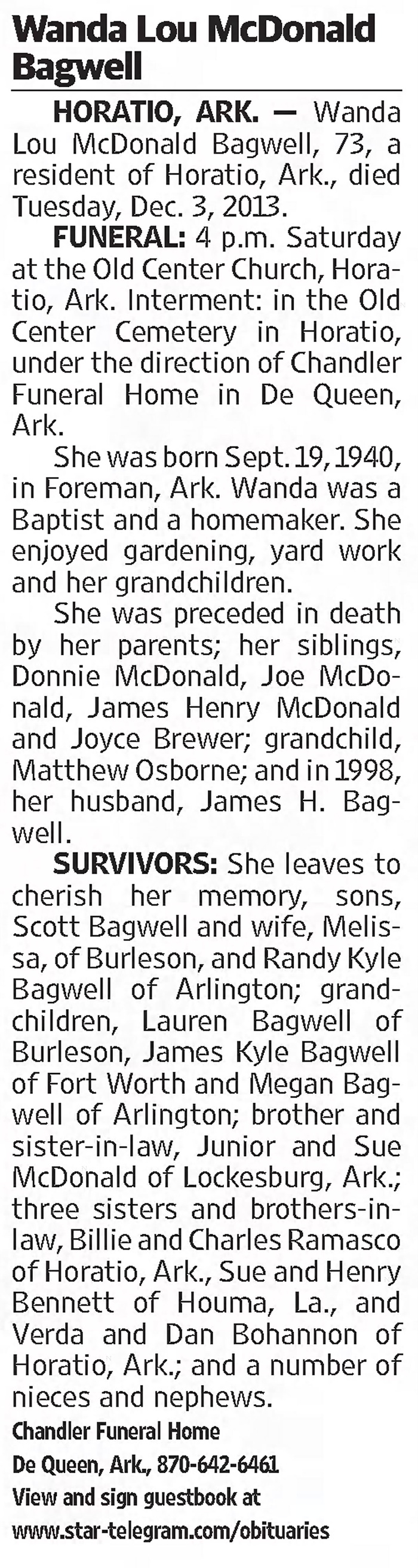 Mrs. Wanda Lou McDonald Bagwell, age 73, a resident of Horatio, Arkansas, died Tuesday, December 3, 2013. She was born on September 19, 1940, in Foreman, Arkansas.