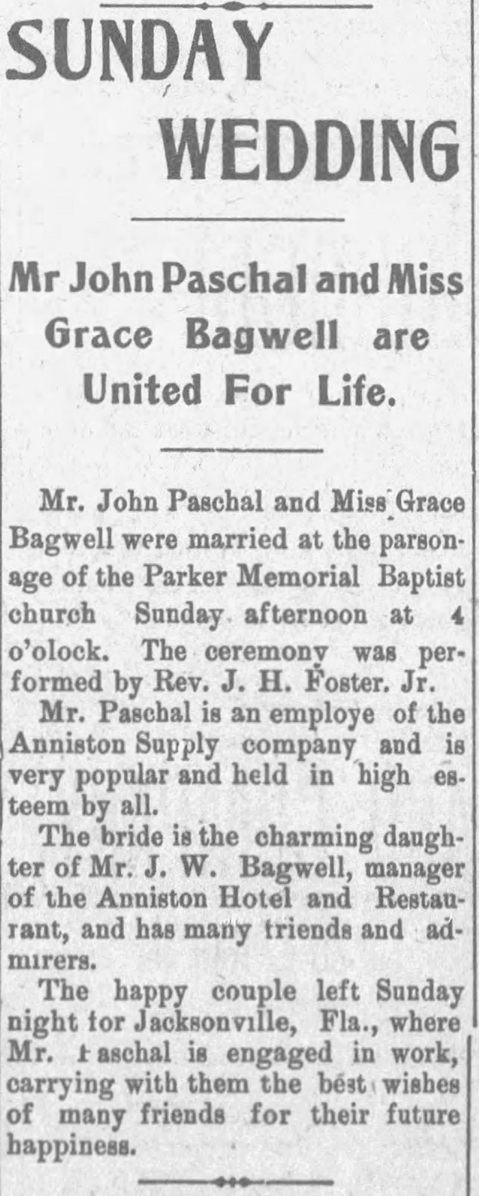 John Floyd Paschal was born on 2 March 1873 in Putnam, Georgia. He married Grace Elizabeth Bagwell, daughter of John Madison W. Bagwell and Savannah Nancy Bagwell, on 2 March 1902 at Parjer Memorial Baptist Church, Anniston, Alabama. John Floyd Paschal died on 12 July 1947 in Birmingham, Jefferson County, Alabama, at age 74.