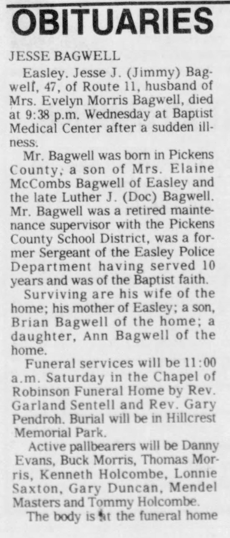 She was predeceased by her husband, Jimmy Bagwell, of Easley.