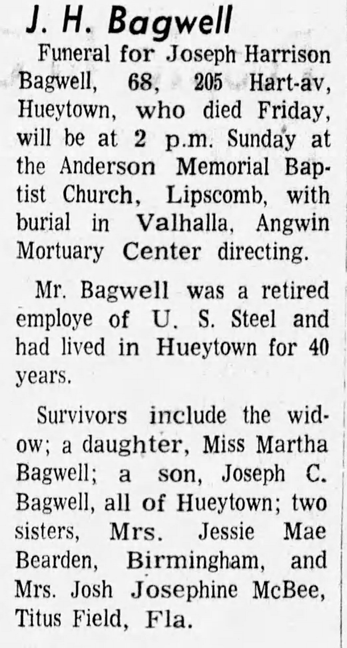 Joseph Harrison Bagwell was born on 6 August 1900.1 He was the son of Skidmore M. Bagwell and Evie O'Neil. Joseph Harrison Bagwell married Pearl Mae Gibson on 16 December 1925 at Dora, Jefferson County, Alabama. Joseph Harrison Bagwell married Goldie Hosmer on 4 September 1937 at Jefferson County, Alabama. Joseph Harrison Bagwell married Mildred (?) after 1938. Joseph Harrison Bagwell died on 23 August 1968 in Hueytown, Alabama, at age 68.1 He was buried at Valhalla Cemetery, Midfield, Jefferson County, Alabama.1
