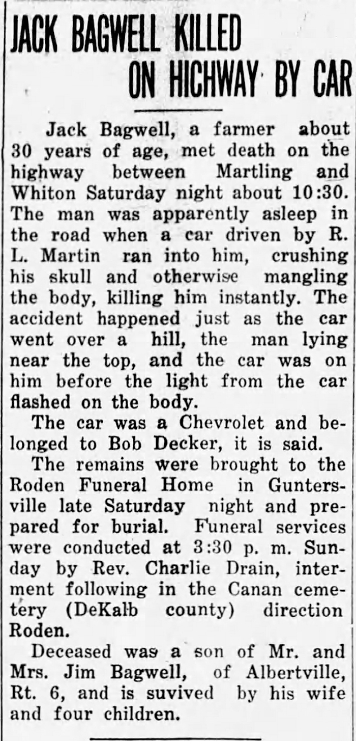 Amos Jackson Bagwell was also known as Jackson Bagwell. He was born on 10 March 1904 in Alabama.1 He was the son of James J. Bagwell and Martha Jane Belue. Amos Jackson Bagwell married Luvie Murphy on 30 September 1927 at Dekalb County, Alabama. Amos Jackson Bagwell died on 25 May 1935 at age 31.1 He was buried on 26 May 1935 at New Canaan Baptist Church Cemetery, DeKalb County, Alabama.1