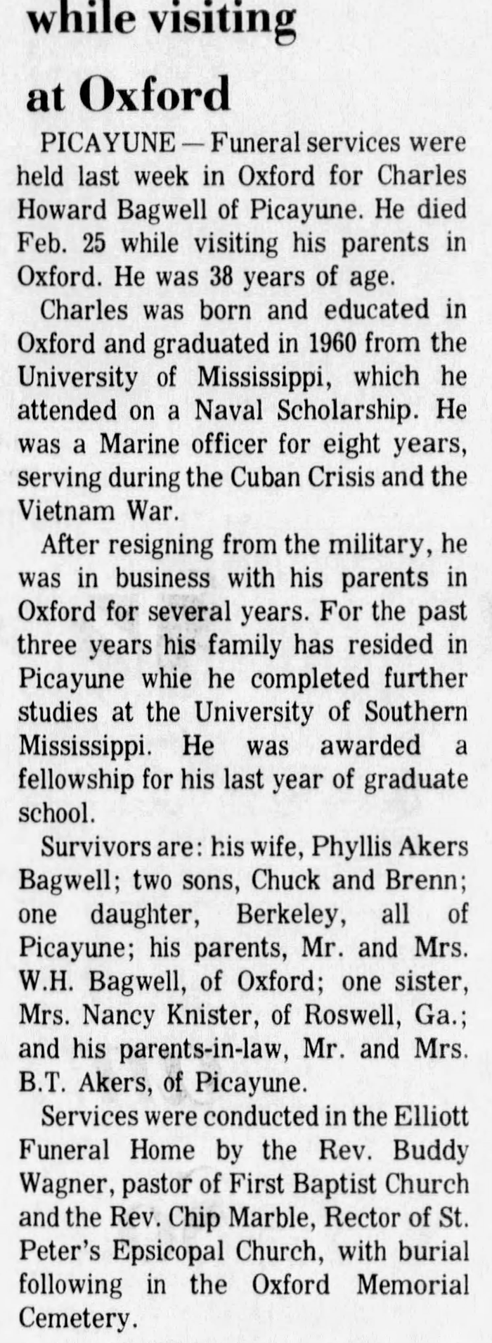 Capt. Charles Howard Bagwell was born on 14 January 1937 in Oxford, Mississippi.1 He was the son of Winon Howard Bagwell and Mamie Lou Edwards.1 He was a Captain in the United States Marine Corp during Vietnam.1 Capt. Charles Howard Bagwell married Phyllis Lynne Akers on 13 May 1961 at Jackson, Mississippi. Capt. Charles Howard Bagwell died on 25 February 1975 in Oxford, Mississippi, at age 38.1 He was buried at Oxford Memorial Cemetery, Oxford, Lafayette County, Mississippi.1
