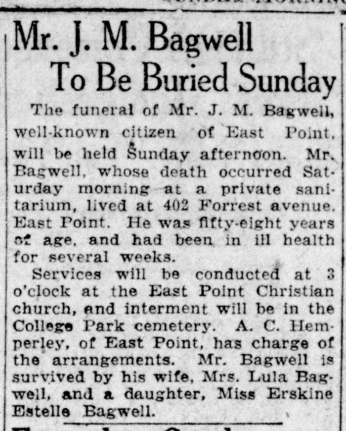 Erskine Estelle Bagwell was born on 6 July 1887 in Georgia. She was the daughter of John W. Bagwell and Daisy Lula Reeves. Erskine Estelle Bagwell died on 12 April 1965 in East Point, Fulton County, Georgia, at age 77. She was buried at College Park Cemetery, East Point, Fulton County, Georgia.