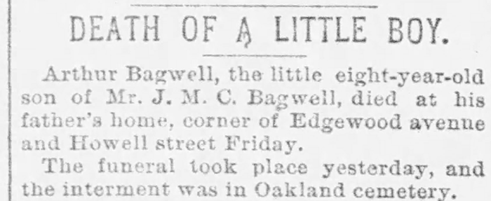 Arthur B. Bagwell was born on 31 August 1882 in North Carolina.1 He was the son of Joseph Madison Calhoun Bagwell and Amanda Missouri Speares. Arthur B. Bagwell died on 13 March 1891 in Fulton County, Georgia, at age 8.1 He was buried at Oakland Cemetery, Atlanta, Fulton County, Georgia.1