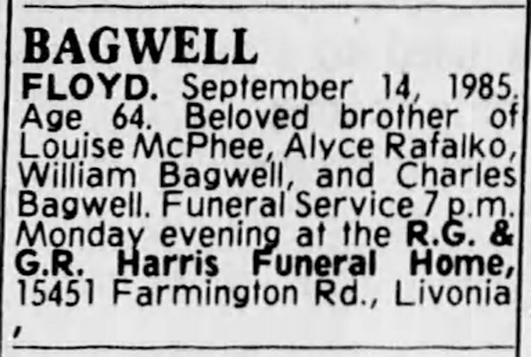 Floyd O. Bagwell was born on 26 March 1921 in Muhlenberg County, Kentucky. He was the son of William Foster Bagwell and Dovie Pearl Rhodes. Floyd O. Bagwell died on 14 September 1985 in Detroit, Wayne County, Michigan, at age 64.