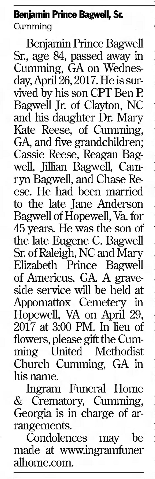 Former Pickens Sentinel editor and publisher, Benjamin Prince Bagwell Sr., age 84, passed away in Cumming, GA on Wednesday, April 26, 2017. He is survived by his son CPT Ben P. Bagwell Jr. of Clayton, NC and his daughter Dr. Mary Kate Reese, of Cumming, GA, and five grandchildren; Cassie Reese, Reagan Bagwell, Jillian Bagwell, Camryn Bagwell, and Chase Reese. He is preceded in death by his wife of 45 years, the late Jane Anderson Bagwell of Hopewell, VA.